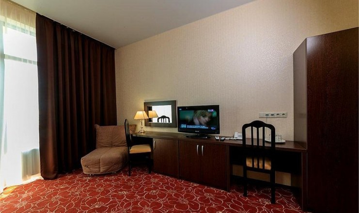 В номере двуспальная кровать, прикроватные тумбочки, светильники, диван раскладной, вешалка, зеркало, обувная полка, столик журнальный, стол, стулья, шкаф, тумба под холодильник, тумба под телевизор, сейф, сплит-система, телевизор, мини-холодильник, пляжные полотенца, санузел (душ, туалет, умывальник, фен, халаты, тапочки, набор полотенец). Номер без балкона. Дополнительное место – диван, евро-раскладушка. Максимальное размещение – 4 человека.