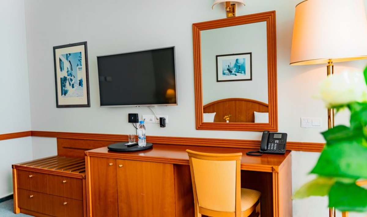 В номере двуспальная кровать, три односпальные кровати, прикроватные тумбочки, светильники, гардеробная, кресла, набор мягкой мебели, диван, вешалка, зеркало, стол, столик журнальный, стулья, шкаф, гладильная доска, утюг, микроволновая печь, музыкальный центр, набор посуды, электрочайник, электрическая плита, кондиционер, телевизор, холодильник, два санузла (сауна, ванна с гидромассажем, душ, туалет, биде, умывальник, фен, халаты, набор полотенец). Коттедж с террасой видом в парк, на террасе набор мебели. Дополнительное место не предусмотрено. Максимальное размещение – 5 человек.