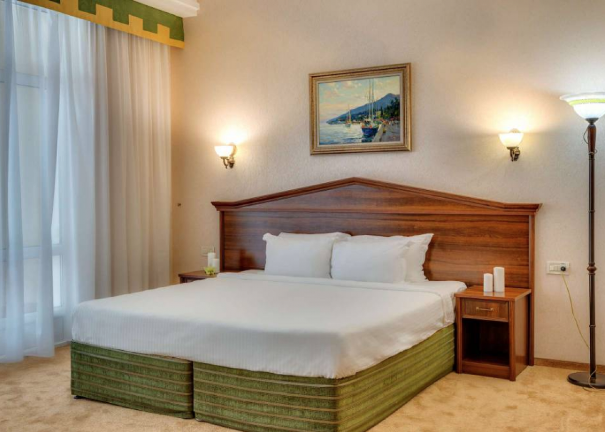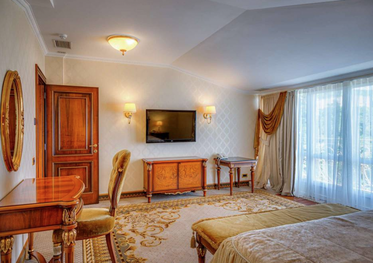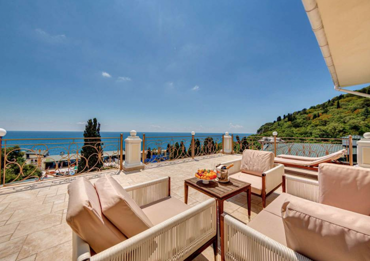 Номер состоит из спальни с двуспальной кроватью, прикроватными тумбочками, светильниками, гостевой спальни с диваном, гостиной-столовой, кабинета с набором мягкой мебели, письменным столом. В номере журнальный столик, стол, стул, зеркало, вешалка, шкаф для одежды, кухонная мебель, гардеробная, комод, телевизор, мини-холодильник, кондиционер, телефон, сейф, микроволновая печь, набор посуды, чайный набор посуды, электрочайник, Wi-Fi, санузел (гидромассажная ванна, душ, умывальник, туалет, фен, набор полотенец, халат, тапочки, косметические средства). Номер с панорамной террасой видом на море, на террасе набор мебели. Дополнительное место – диван. Максимальное размещение – 6 человек.