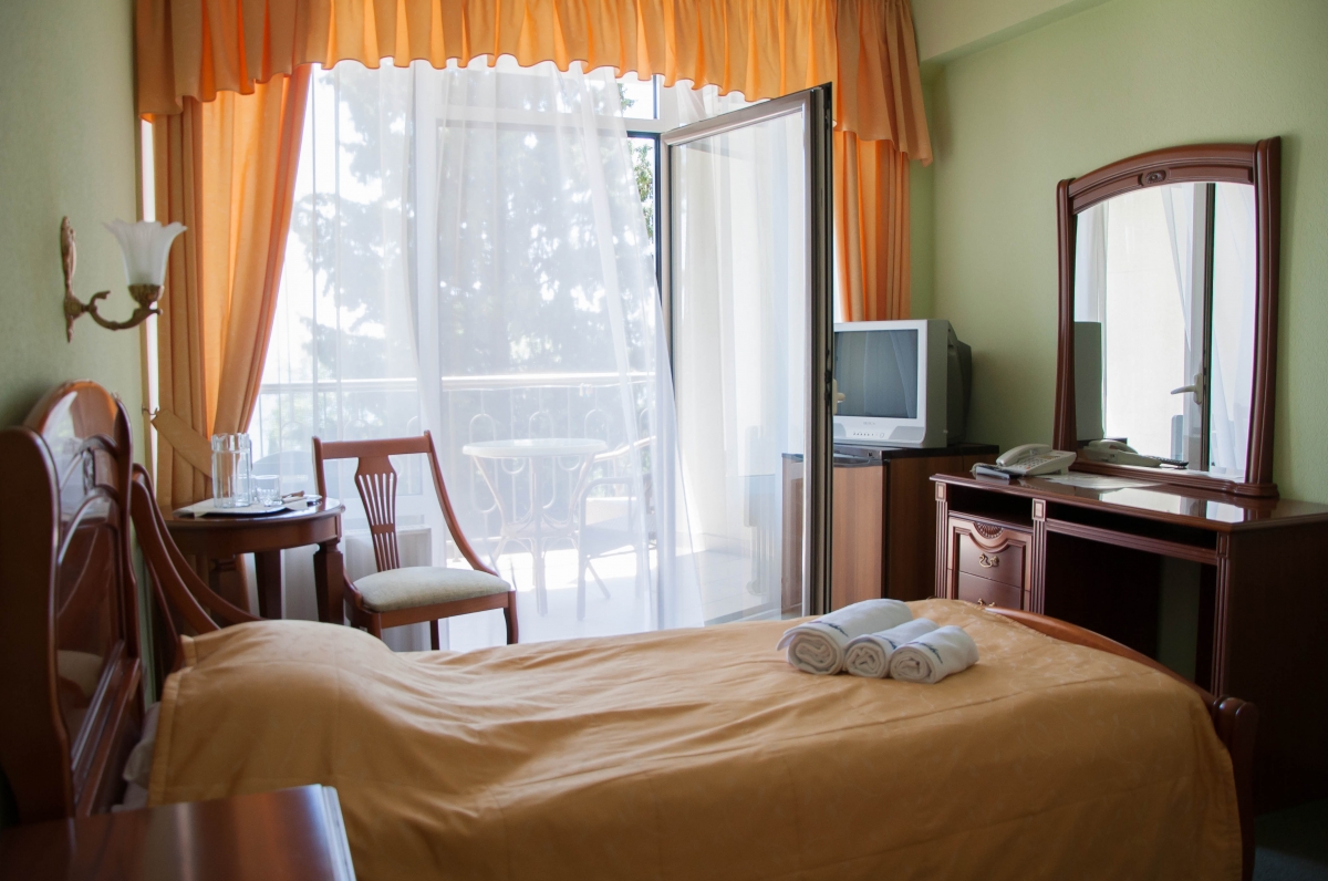 Однокомнатный номер. Площадь 20 — 29 м. кв. расположены на 4 этаже, с балконом видом на южную сторону. В номерах имеется: две односпальные кровати, диван-малютка или кресло (доп. место), холодильник, телевизор, кондиционер, сейф, фен, халаты, тапочки, мини-парфюмерия, балконная мебель. Санузел: душ с поддоном, умывальник, туалет. Дополнительное место раскладной диван. Максимальное размещение 4 человека.