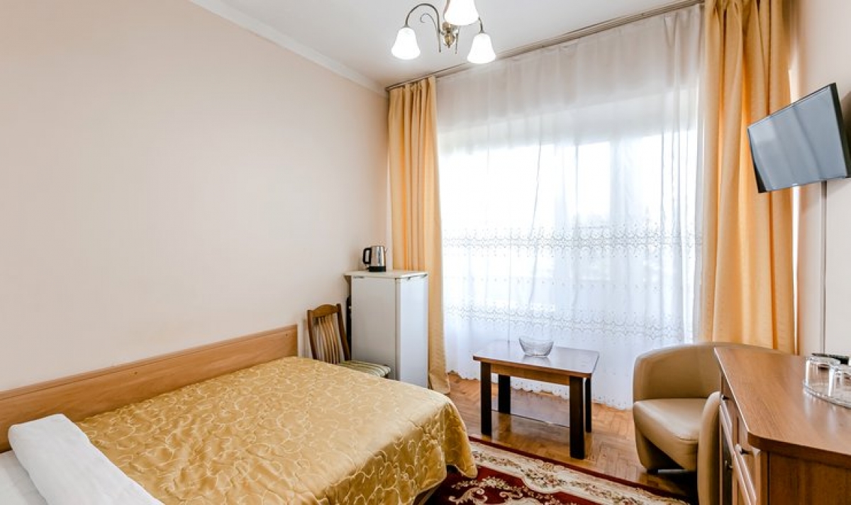 В номере двуспальная кровать, прикроватные тумбочки, светильники, комод, диван, вешалка, зеркало, стол, стулья, шкаф, чайный набор посуды, электрочайник, кондиционер, телевизор, холодильник, санузел (ванна, туалет, умывальник, фен, набор полотенец). Номер без балкона. Дополнительное место – евро-раскладушка. Максимальное размещение – 3 человека.