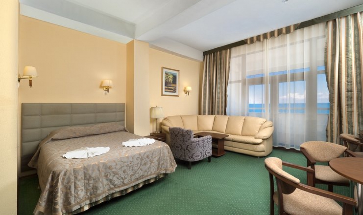 В номере двуспальная кровать, прикроватные тумбочки, светильники, диван, обувная полка, вешалка, зеркало, стол, стулья, шкаф, сейф, кондиционер, телевизор, телефон, холодильник, санузел (ванна/душ, умывальник, туалет, фен, набор полотенец). Номер с балконом, на балконе сушилка. Дополнительное место - диван. Максимальное размещение – 4 человека.