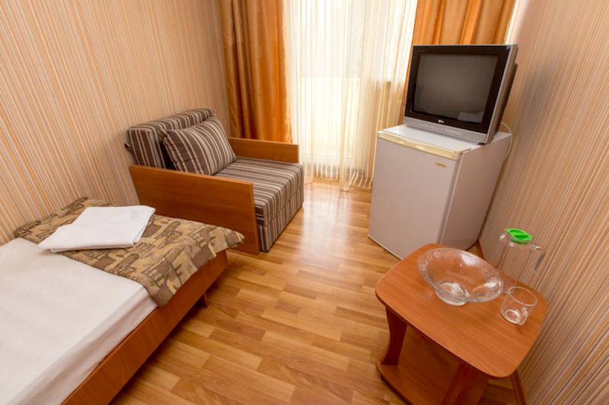 Номер состоит из спальни и гостиной, в спальне двуспальная кровать, прикроватные тумбочки, два настенных бра, в гостиной раскладной диван. В номере: журнальный столик, зеркало, шкаф для одежды, кресло, стол, стулья, телевизор, холодильник, кондиционер, сейф, чайник, набор посуды, WI-FI, санузел (душ, умывальник, туалет, фен). Номер с просторным балконом видом на горы и парк. Дополнительное место – раскладной диван. Максимальное размещение – 4 человека.