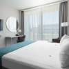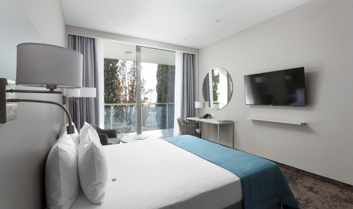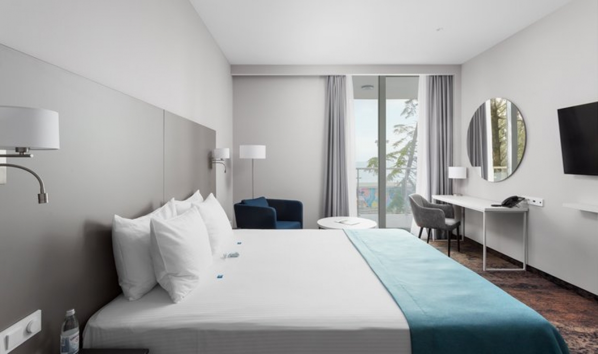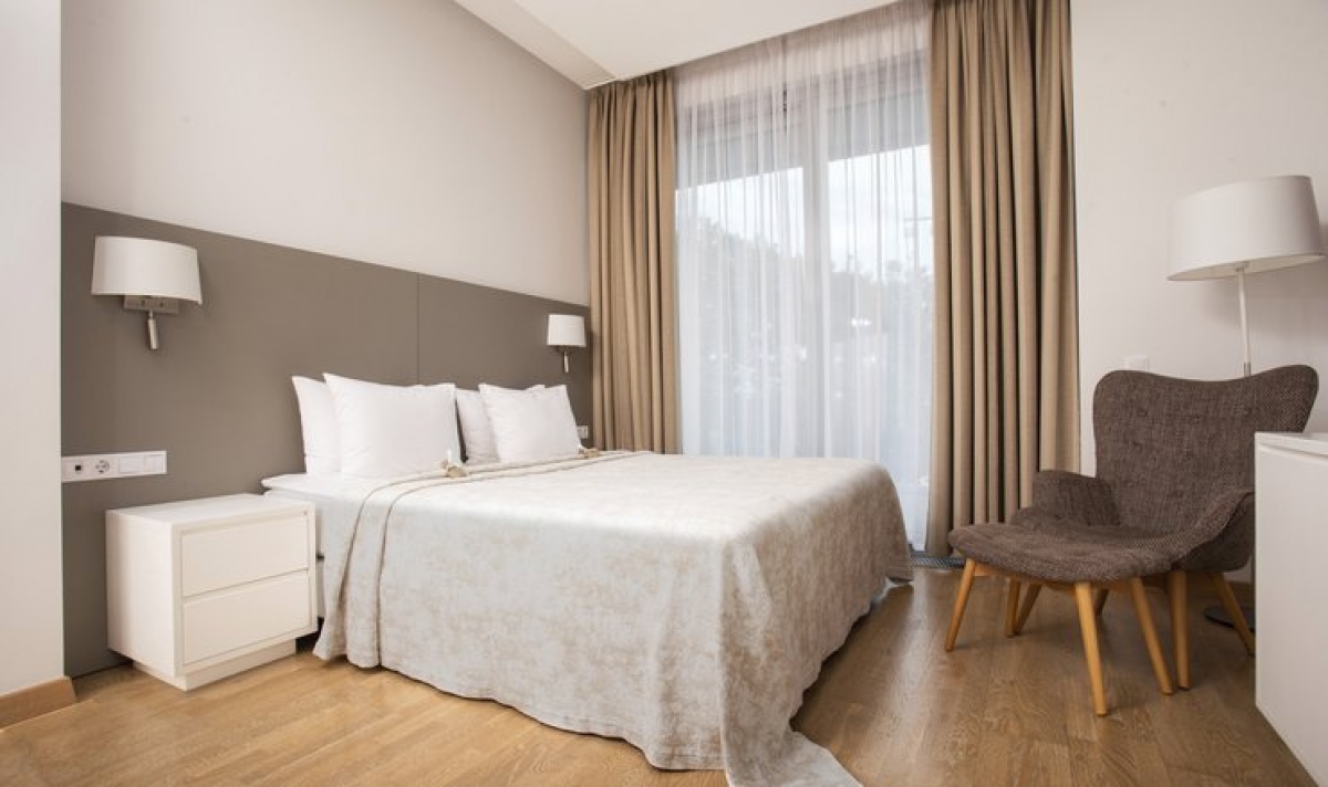 В номере четыре двуспальные кровати, прикроватные тумбочки, светильники, вешалка, зеркало, стол, стулья, шкаф, микроволновая печь, плита электрическая, посудомоечная машина, стиральная машина, электрочайник, сплит-система, телевизор, холодильник, санузел (ванна, туалет, умывальник, фен, халаты, тапочки, набор полотенец). Номер с балконом на балконе набор мебели и сушилка. Дополнительное место не предусмотрено. Максимальное размещение – 8 человек.
