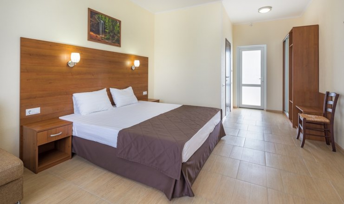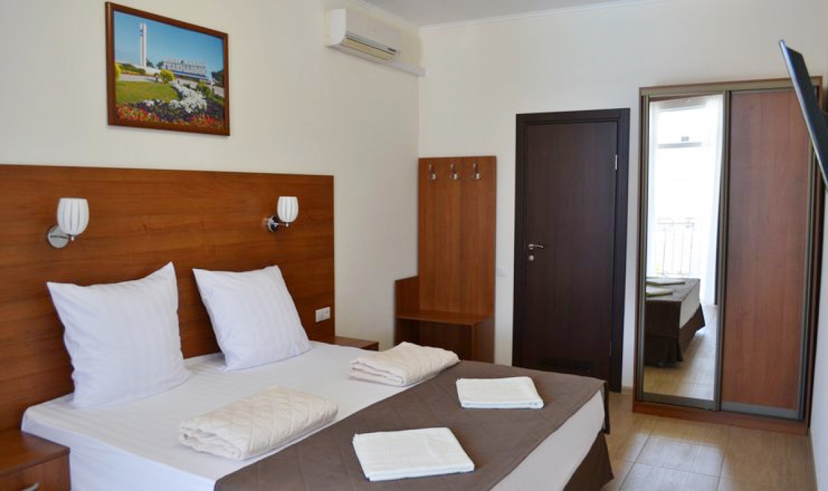 В номере двуспальная кровать, прикроватные тумбочки, светильники, диван, вешалка, зеркало, стол, стулья, шкаф, чайный набор посуды, электрочайник, утюг, гладильная доска, сплит-система, телевизор, мини-холодильник, санузел (душ, умывальник, туалет, набор полотенец). Дополнительное место – кресло-кровать, евро-раскладушка. Максимальное размещение – 4 человека.